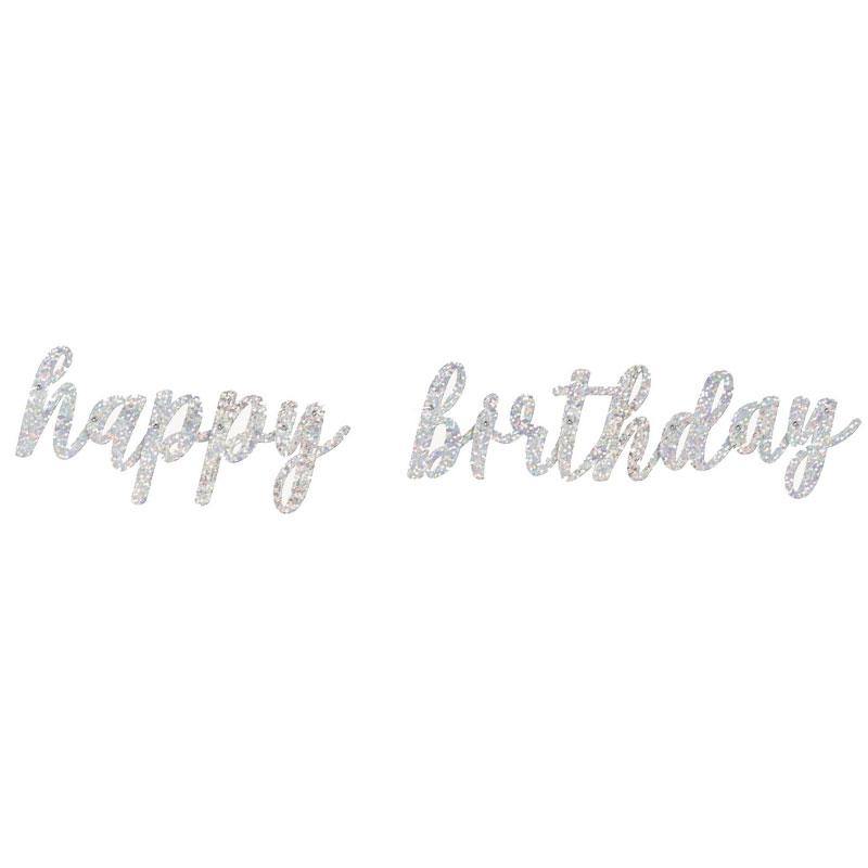 Decorate your party space with this beautiful prismatic silver ‘happy birthday’ banner.